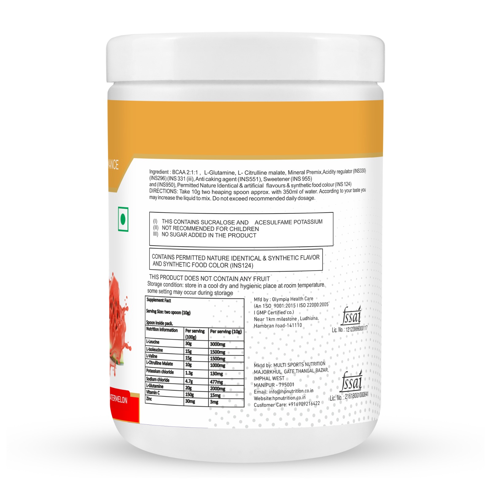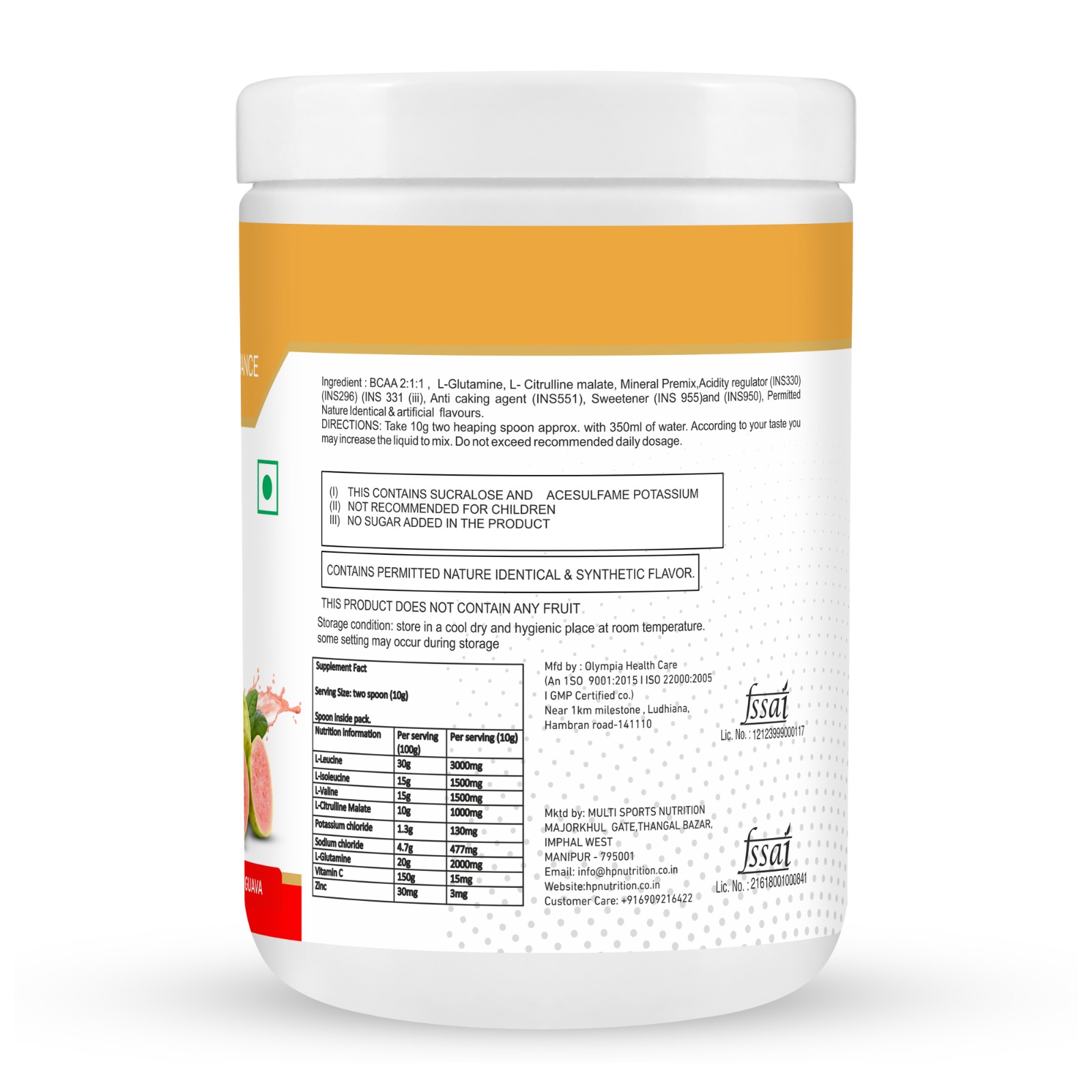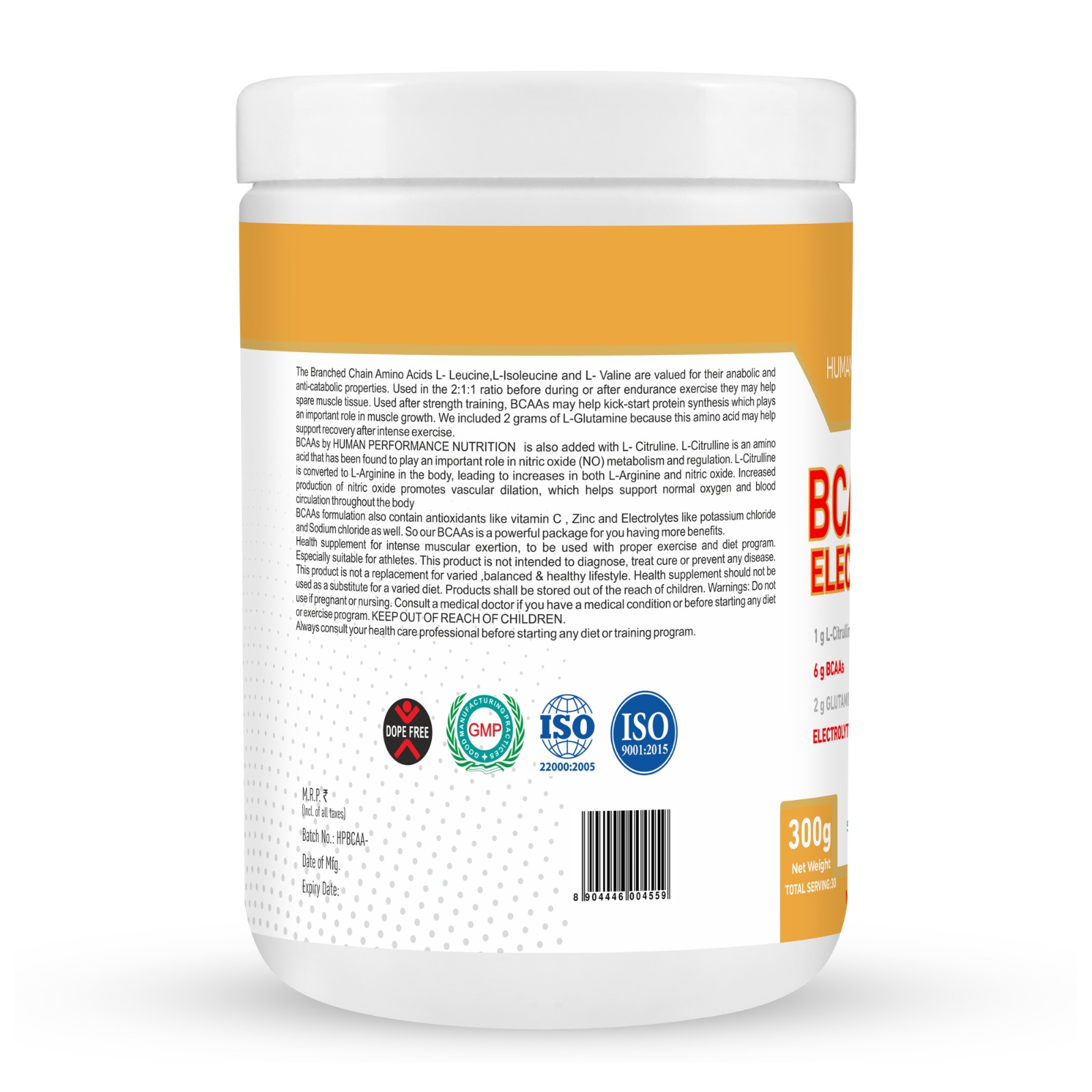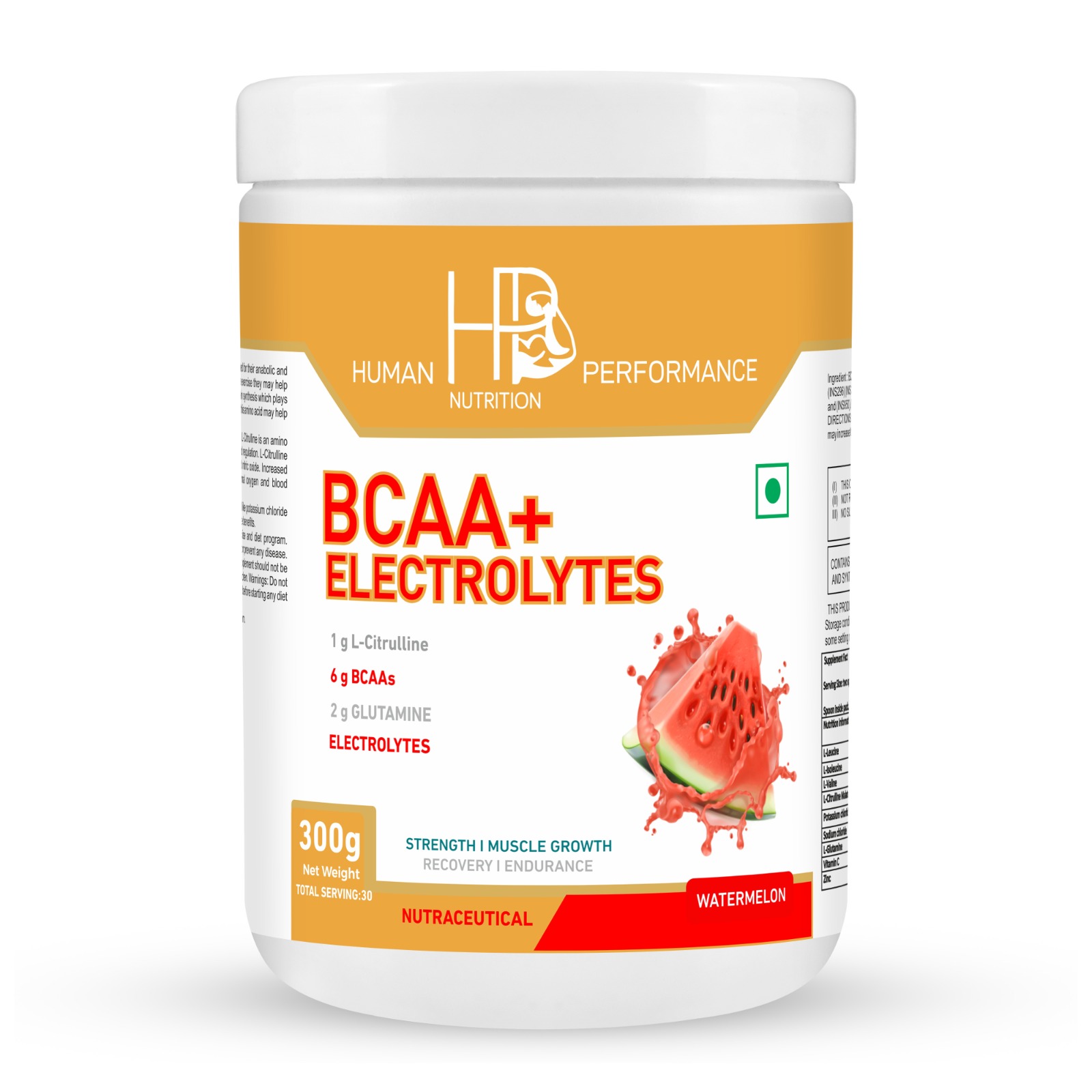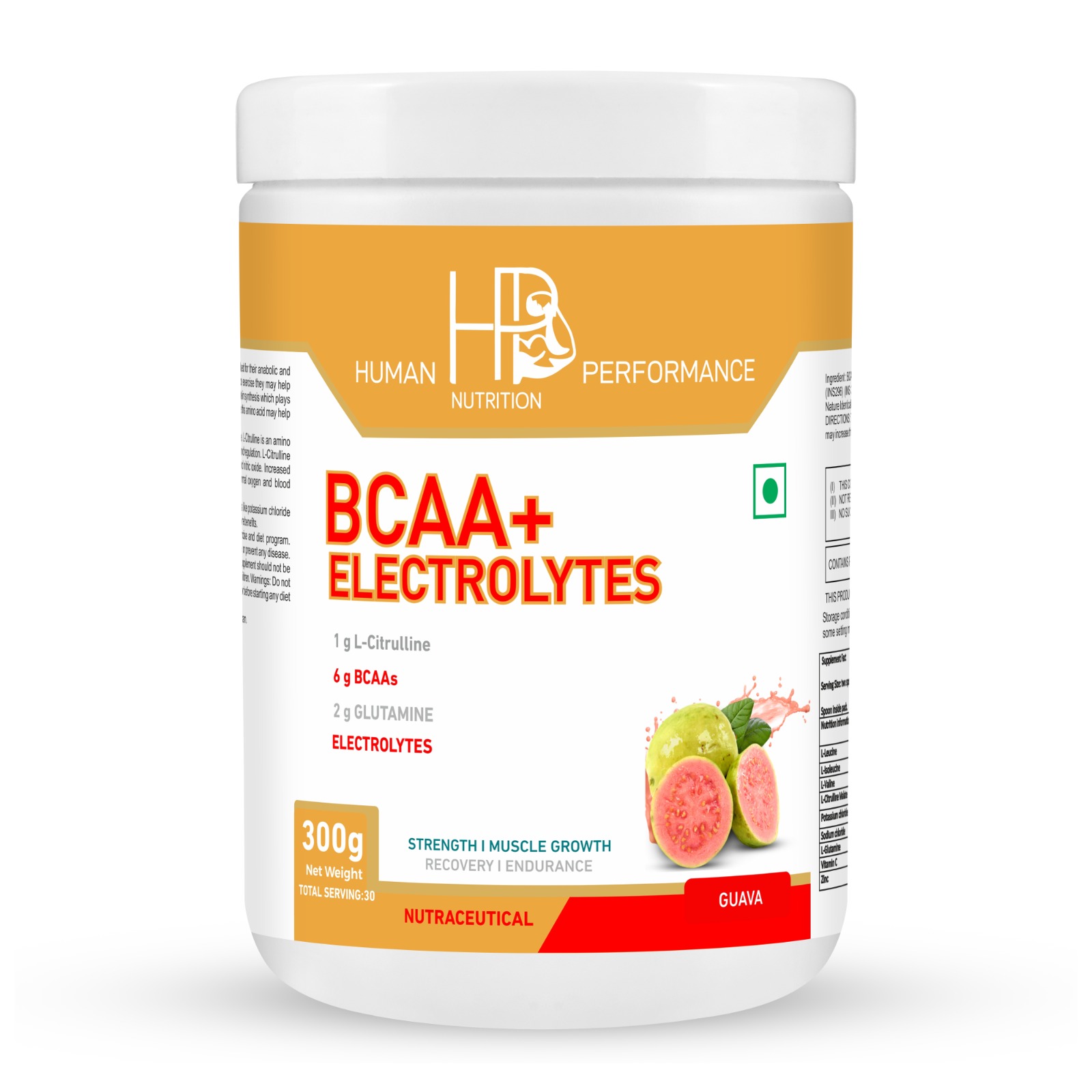 The Branched Chain Amino Acids L- Leucine,L-Isoleucine and L- Valine are valued for their anabolic and anti-catabolic properties. Used in the 2:1:1 ratio before during or after endurance exercise they may help spare muscle tissue. Used after strength training, BCAAs may help kick-start protein synthesis which plays an important role in muscle growth. We included 2 grams of L-Glutamine because this amino acid may help support recovery after intense exercise. BCAAs by HUMAN PERFORMANCE NUTRITION is also added with L. Citruline. L-Citrulline is an amino acid that has been found to play an important role in nitric oxide (NO) metabolism and regulation. L-Citrulline is converted to L-Arginine in the body, leading to increases in both L-Arginine and nitric oxide. Increased production of nitric oxide promotes vascular dilation, which helps support normal oxygen and blood circulation throughout the body. BCAAs formulation also contain antioxidants like vitamin C , Zinc and Electrolytes like potassium chloride and Sodium chloride aswell. So our BCAAs is a powerful package foryou having more benefits. Health supplement for intense muscular exertion, to be used with proper exercise and diet program. Especially suitable for athletes. This product is not intended to diagnose, treat cure or prevent any disease.